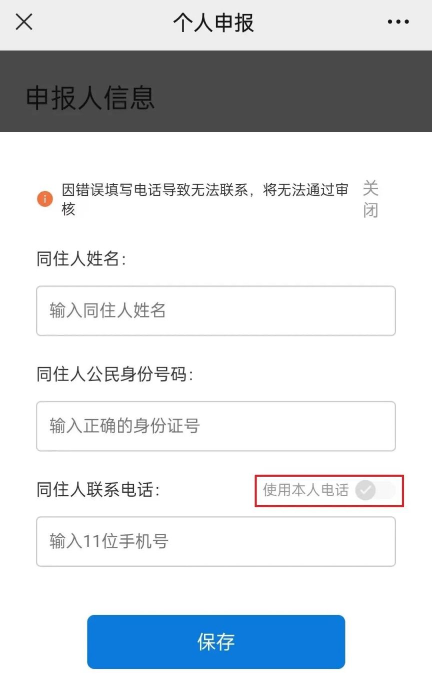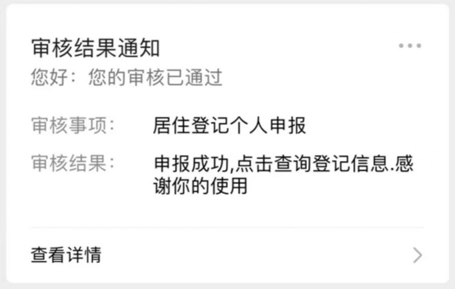 温馨提示:①填报同住人信息时,申报人本人信息也将一并提交;②若同住人为18岁以下未成年人及65岁以上老人,可单独为他们填写联系电话,也可以勾选“使用本人电话”选项,系统将以填报人的电话作为同住人的联系电话提交。 7、申报结果通知。公安机关将对登记申报信息进行审核,审核结果将以微信公众号消息的方式通知,如有疑问请咨询居住地派出所。
