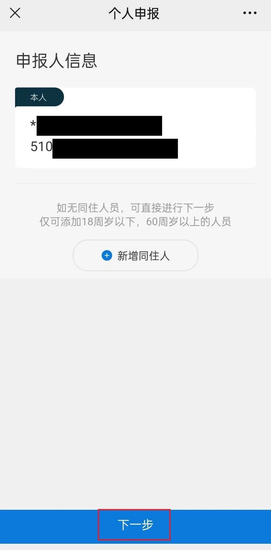6、核对“申报人信息”是否为待申报人,无误则点击下一步。若非本人,返回“微户政”主页——个人中心重新进行实人认证以修改。