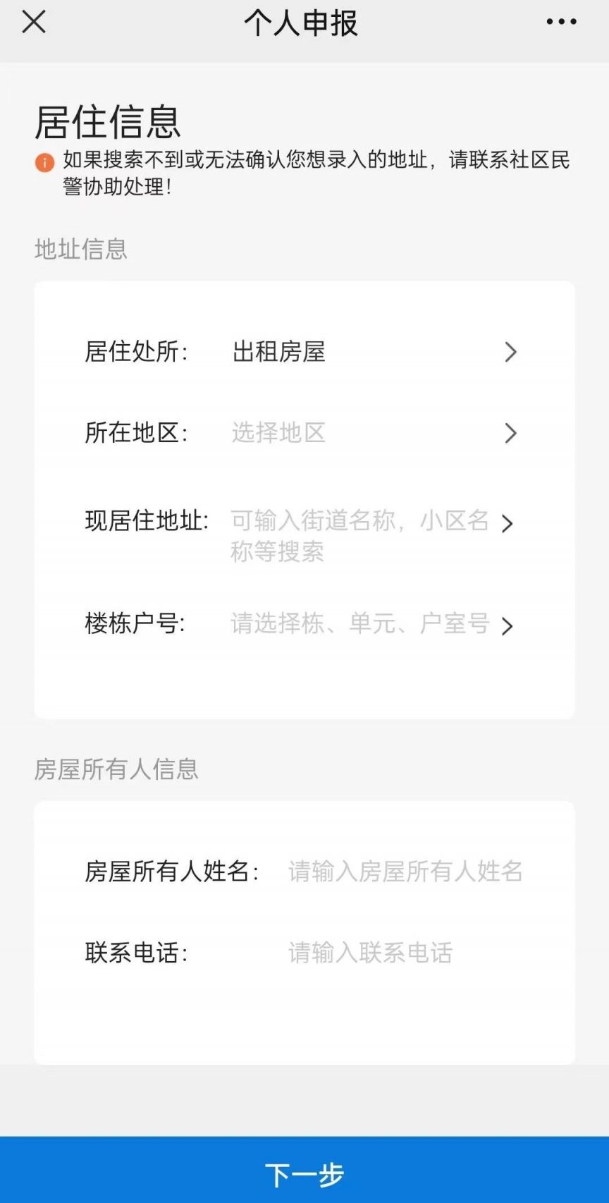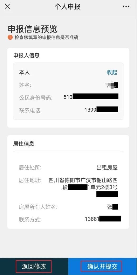 填写“居住处所”、“所在地区”、“现居住地址”、“楼栋户号”等信息。确认无误后点击下一步。确认预览申报信息,无误点击“确认提交”,仍需修改点击“返回修改”。